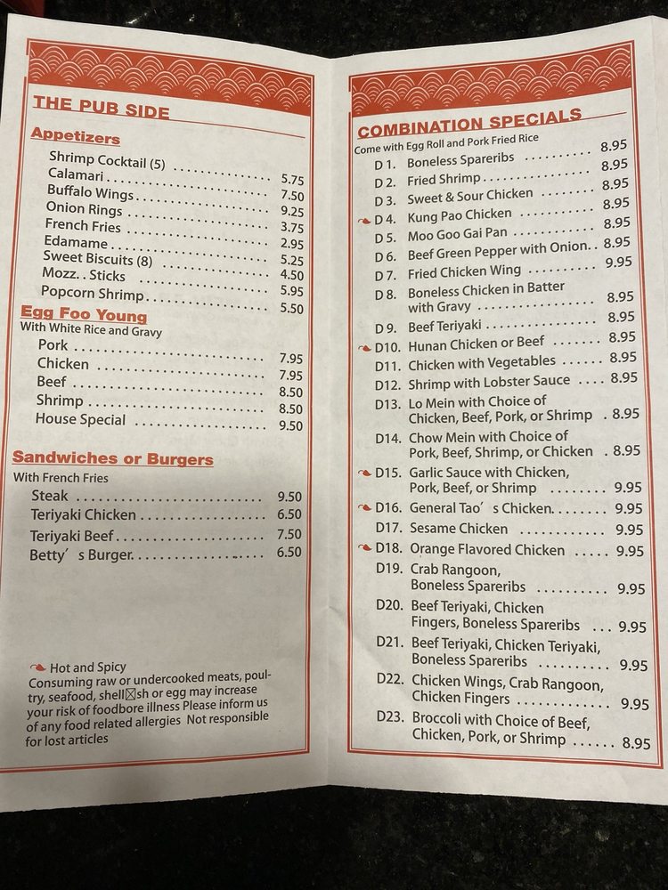 Betty's Pub & Chinese Restaurant in Cranston, RI offers a wide array of Chinese dishes with a cozy and unassuming atmosphere. The menu boasts delicious appetizers like boneless spare ribs and sticky oyster sauce wings, along with flavorful soups such as wonton and hot and sour. The chicken dishes, like General Tso's chicken and sesame chicken, are highly praised by customers for their generous portions and great flavors. The reviews mention the delicious food, great prices, and friendly service at Betty's. If you're in the mood for authentic Chinese cuisine in a casual setting, Betty's Pub & Chinese Restaurant is a hidden gem worth trying.